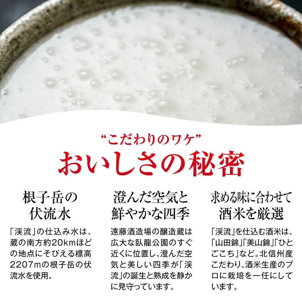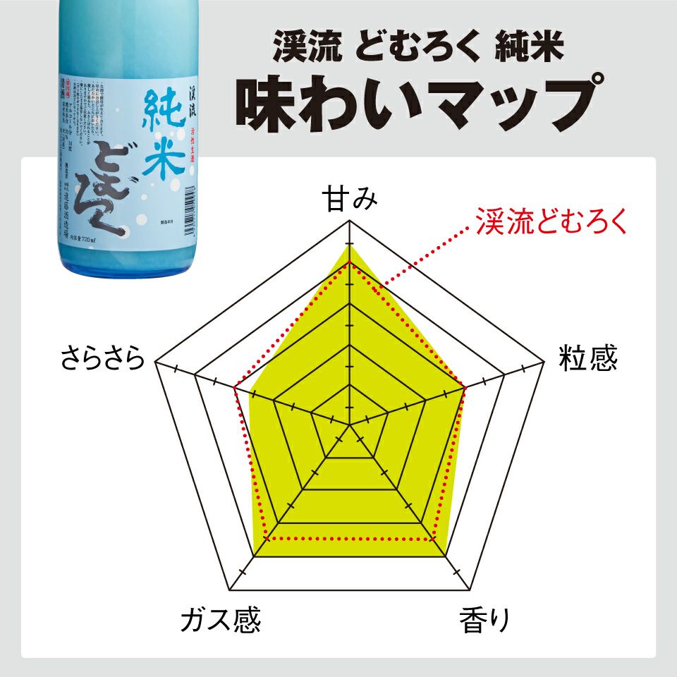 江戸時代から蔵に伝わってきた昔ながらの日本酒レシピを原点に製造し、発売以来20年にわたり全国の日本酒ファンにご愛顧いただいている「渓流どむろく」。「プチプチ、シュワァ〜」という独特の口当たりと、甘みと酸味のバランスのよい飲み口で、毎年12月下旬に醸し上がり、夏頃までに売り切れる人気商品です。