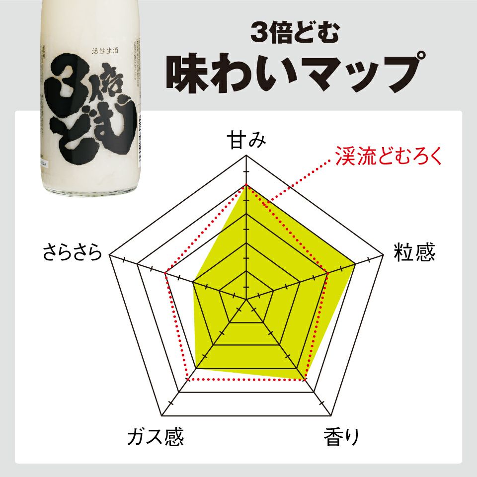 大人気どむろくシリーズに「3倍どむ」が仲間入り!とろけるような甘味と発酵ガスの調和はそのままに、もろみ比率を3倍にして詰めました。とろとろな超濃厚どむろくをぜひお試しください!